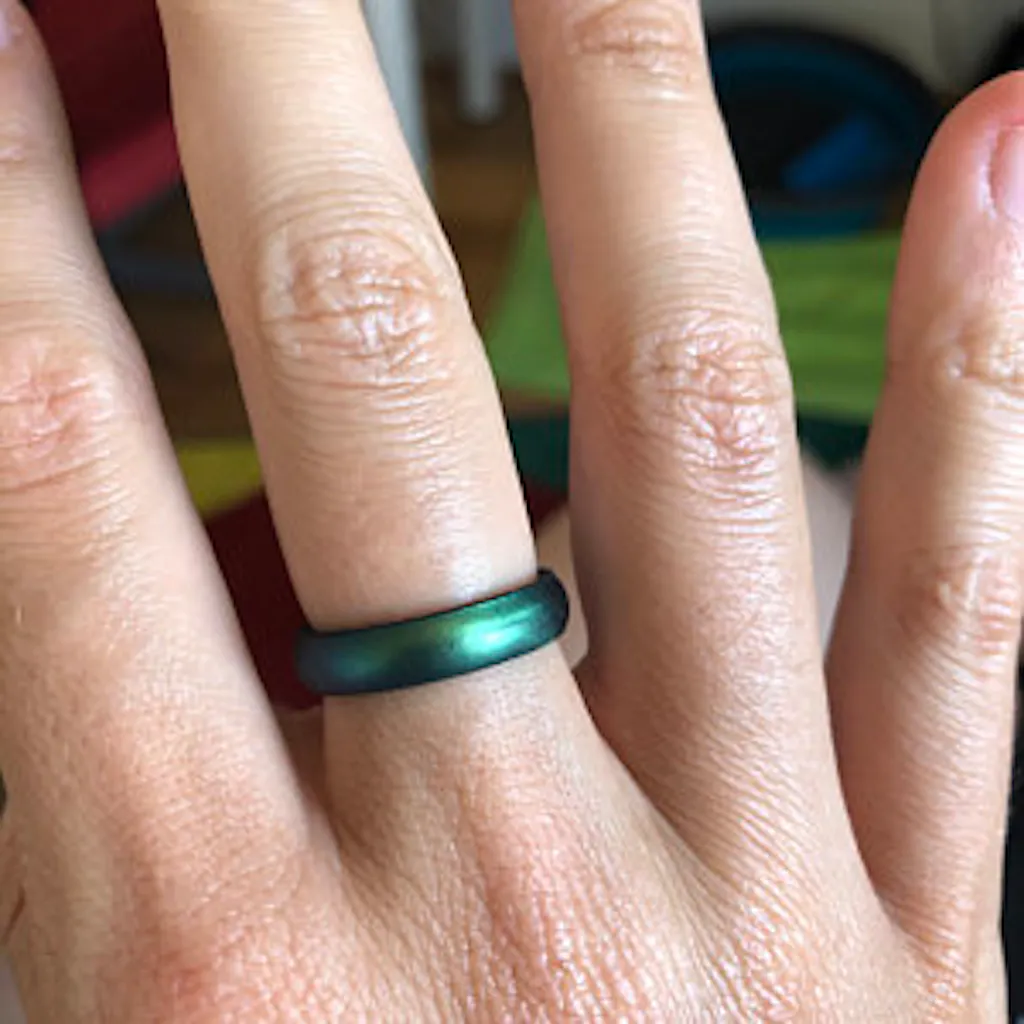 Crafted from 100% hypoallergenic, food-grade silicone, our rings are safe for all skin types. Even our metallic pigments are metal-free. Colors are infused throughout the ring - not just coated - so they stay vibrant, wear after wear.