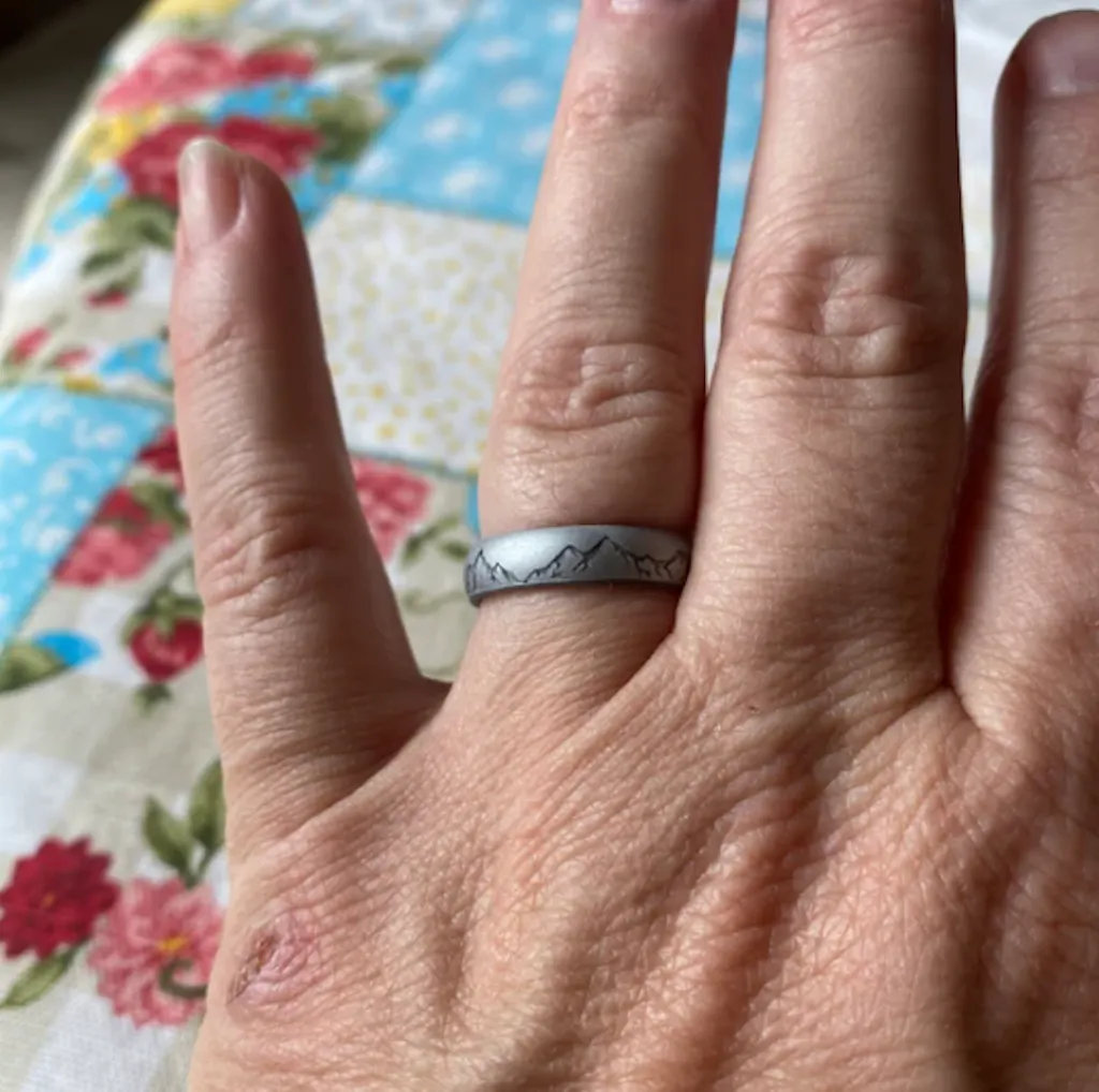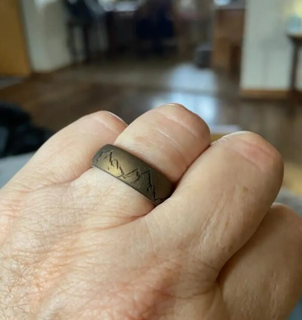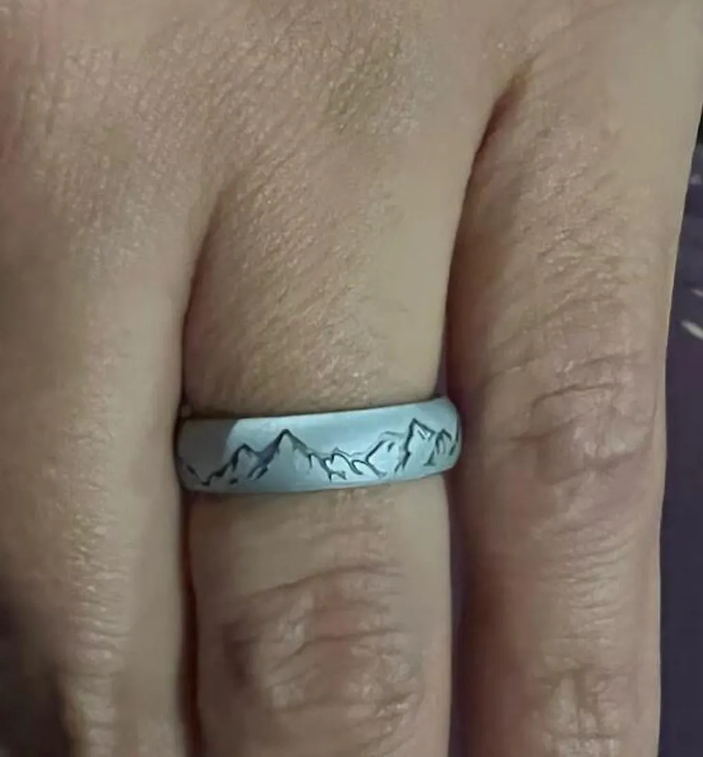 This ring showcases a breathtaking panoramic mountain ridge engraving, letting you carry the beauty of the peaks wherever you go.