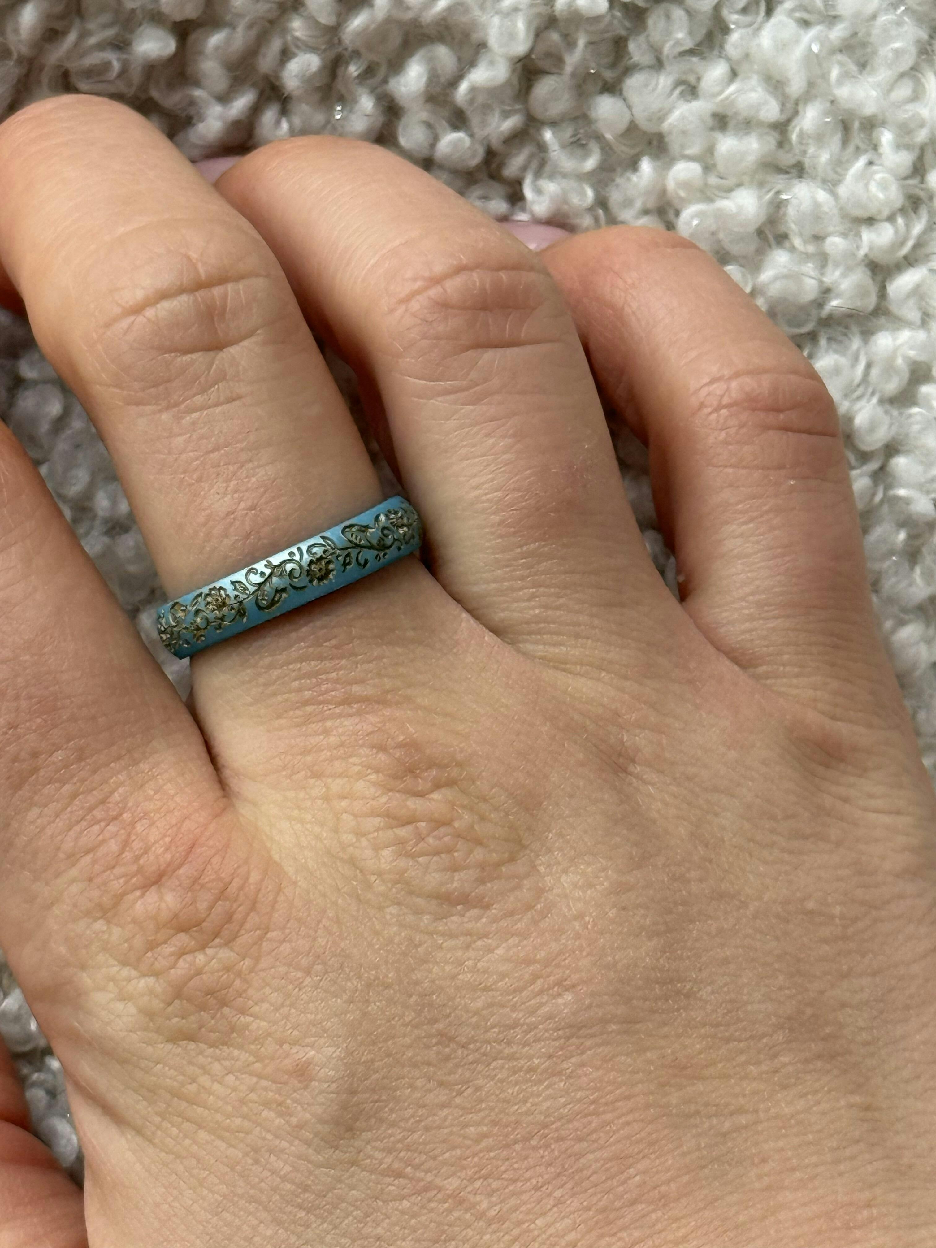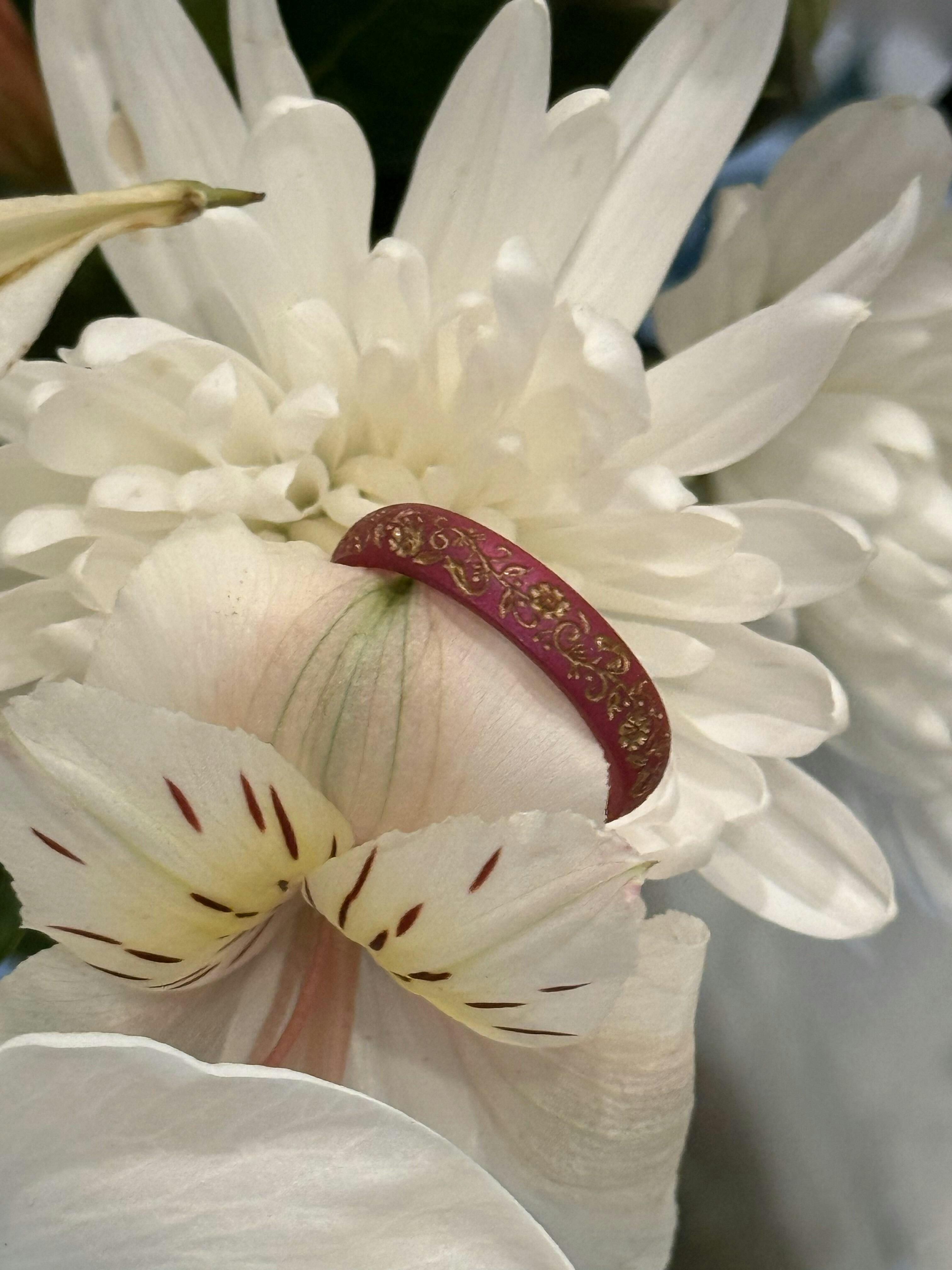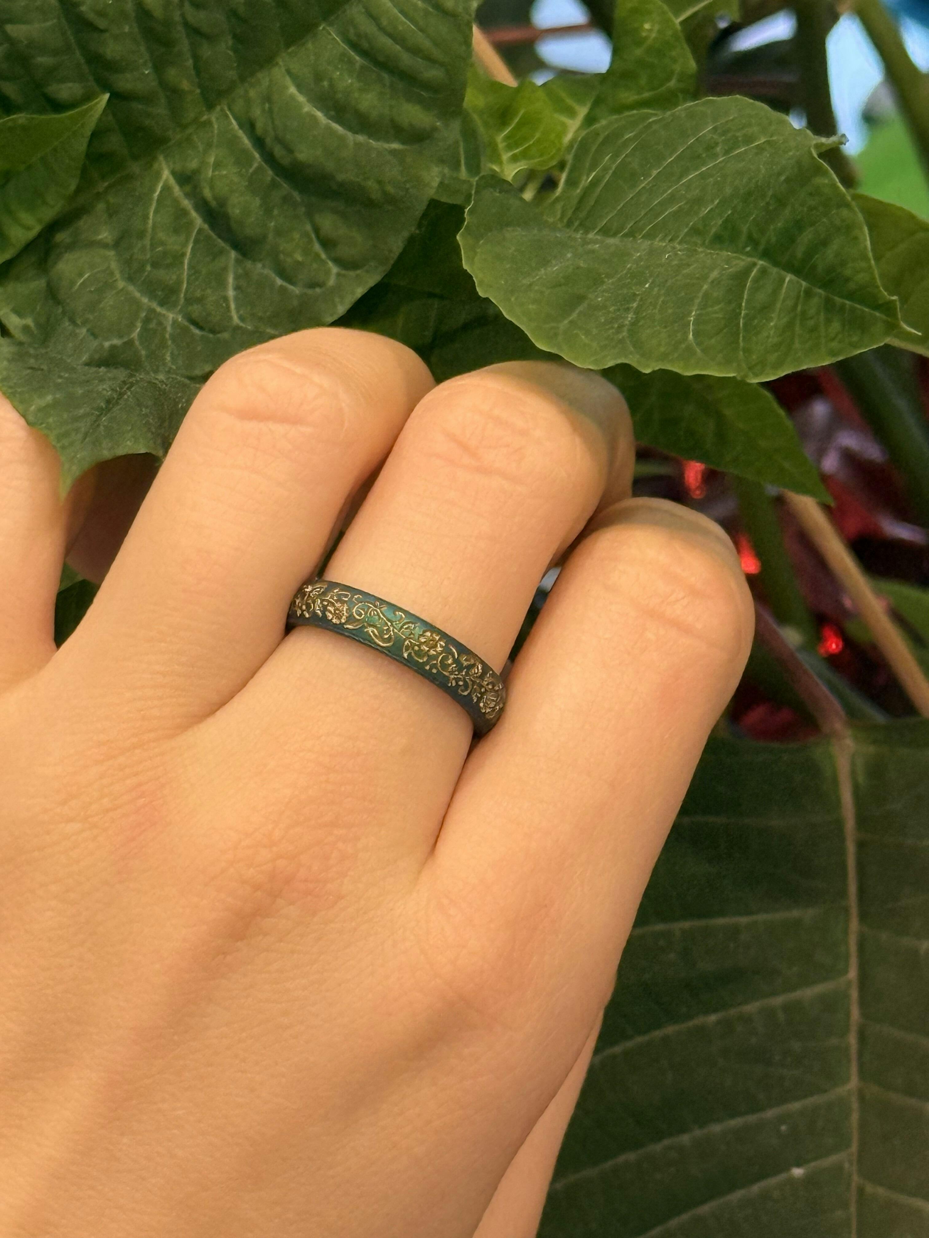The Nordic Bloom ring features delicate Scandinavian floral motifs engraved and hand-inlaid with gold, bringing timeless artistry to a modern silicone band. Set on our Arc 4mm band, its softly rounded profile creates a sleek, minimal look with effortless, all-day comfort.