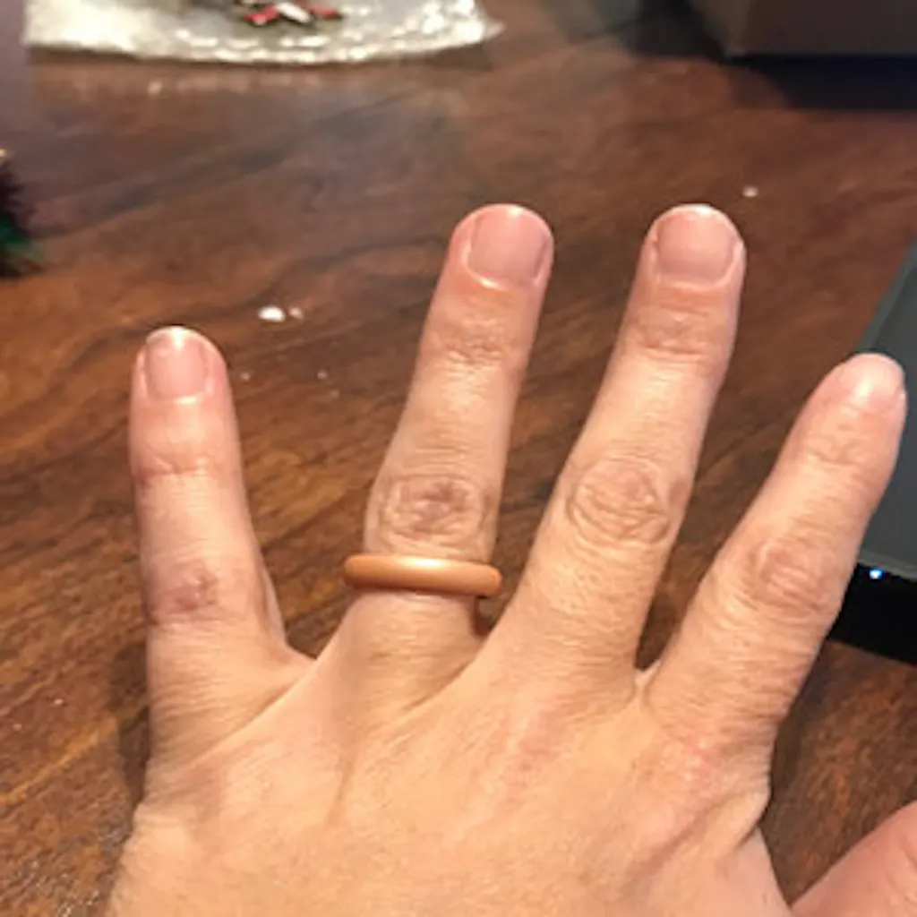 Crafted from 100% hypoallergenic, food-grade silicone, our rings are safe for all skin types. Even our metallic pigments are metal-free. Colors are infused throughout the ring - not just coated - so they stay vibrant, wear after wear.