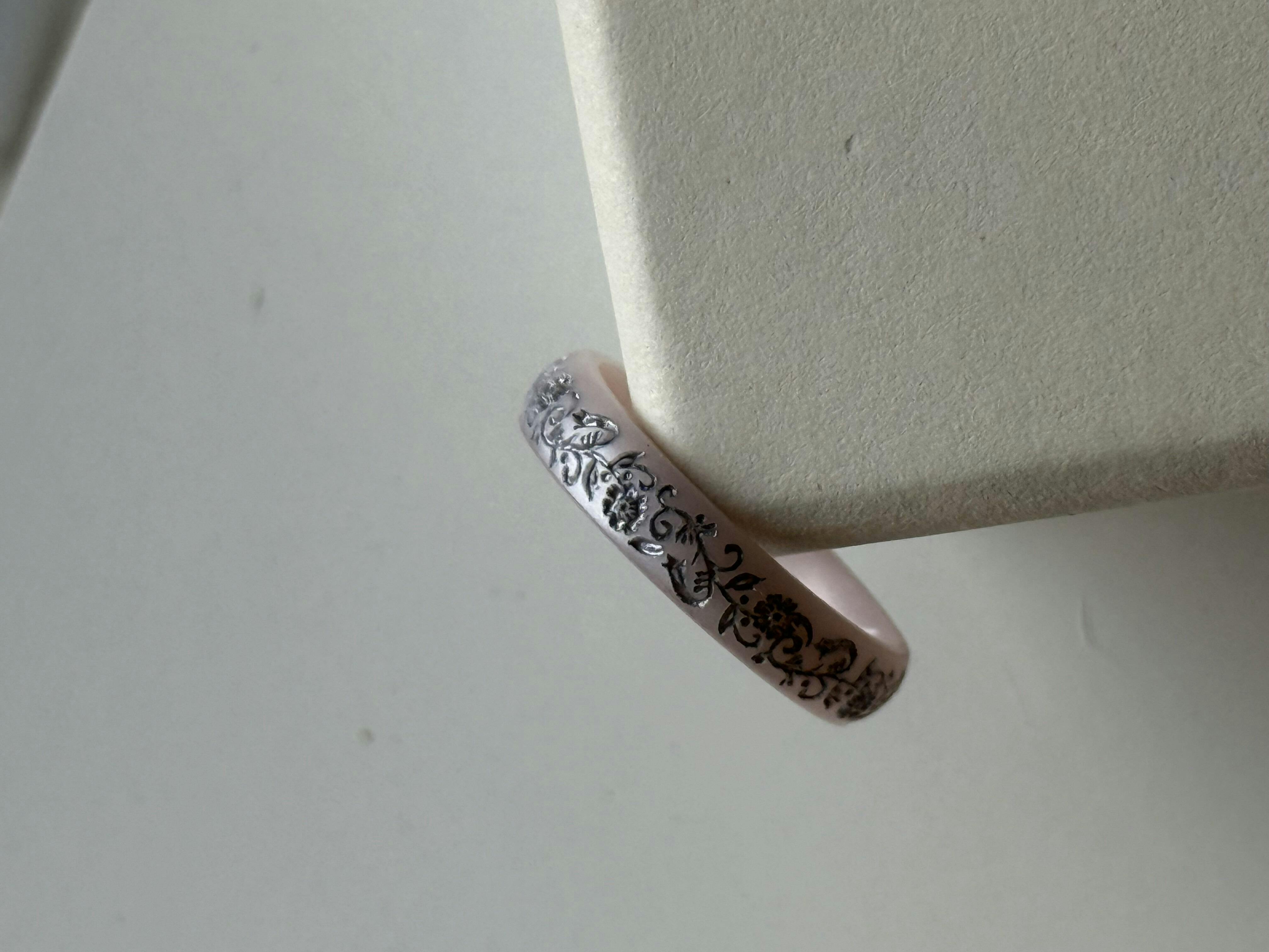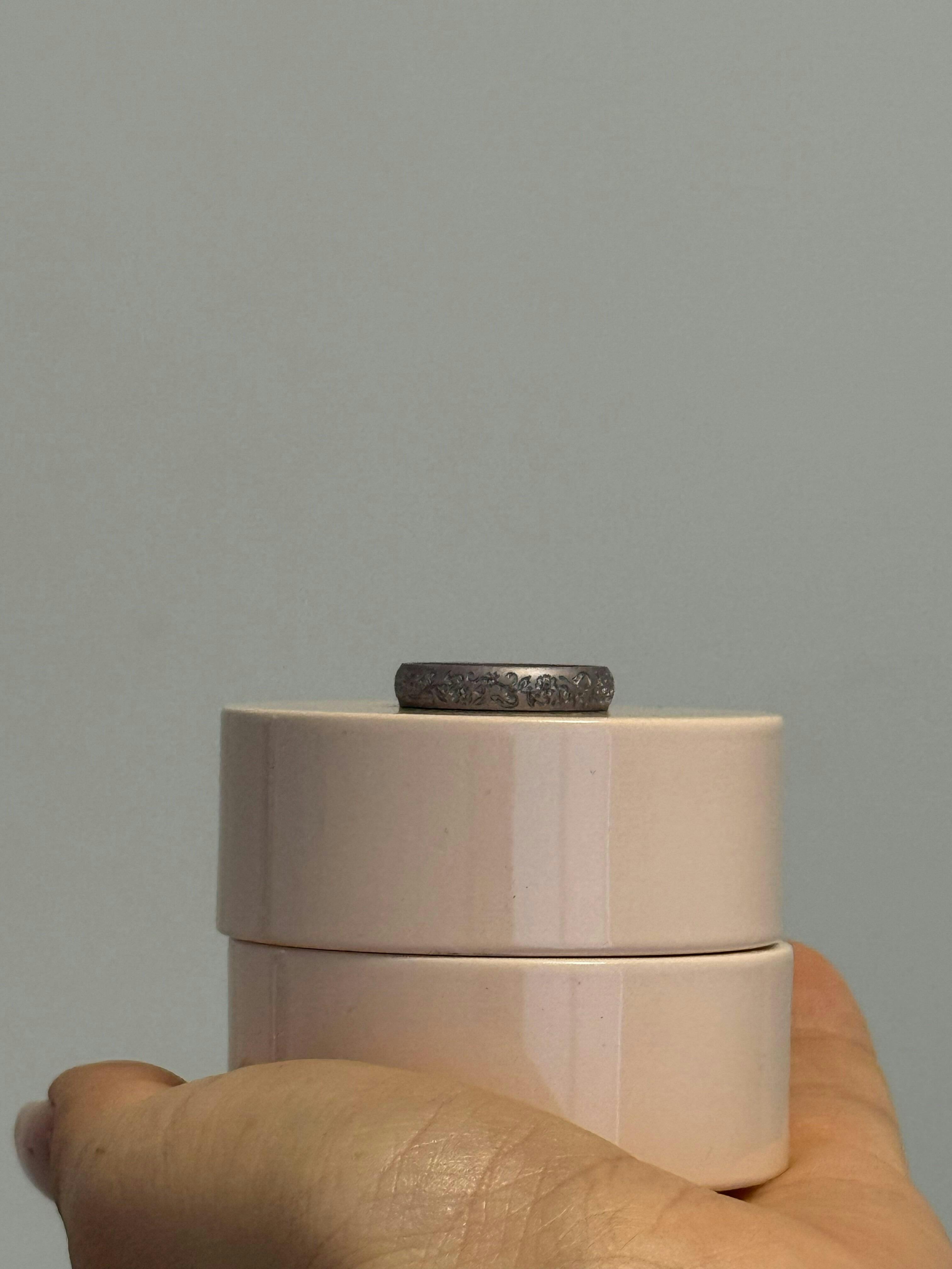 Delicate, detailed, and designed for life in motion - the Nordic Bloom ring features flowing floral motifs inspired by Scandinavian folk art, engraved and hand-filled with silver silicone ink for a soft, elegant shimmer. The slim 4mm Arc band has a gently curved outer profile, giving it a clean, modern silhouette that feels as good as it looks. It's also gently curved on the inside for maximum breathability.