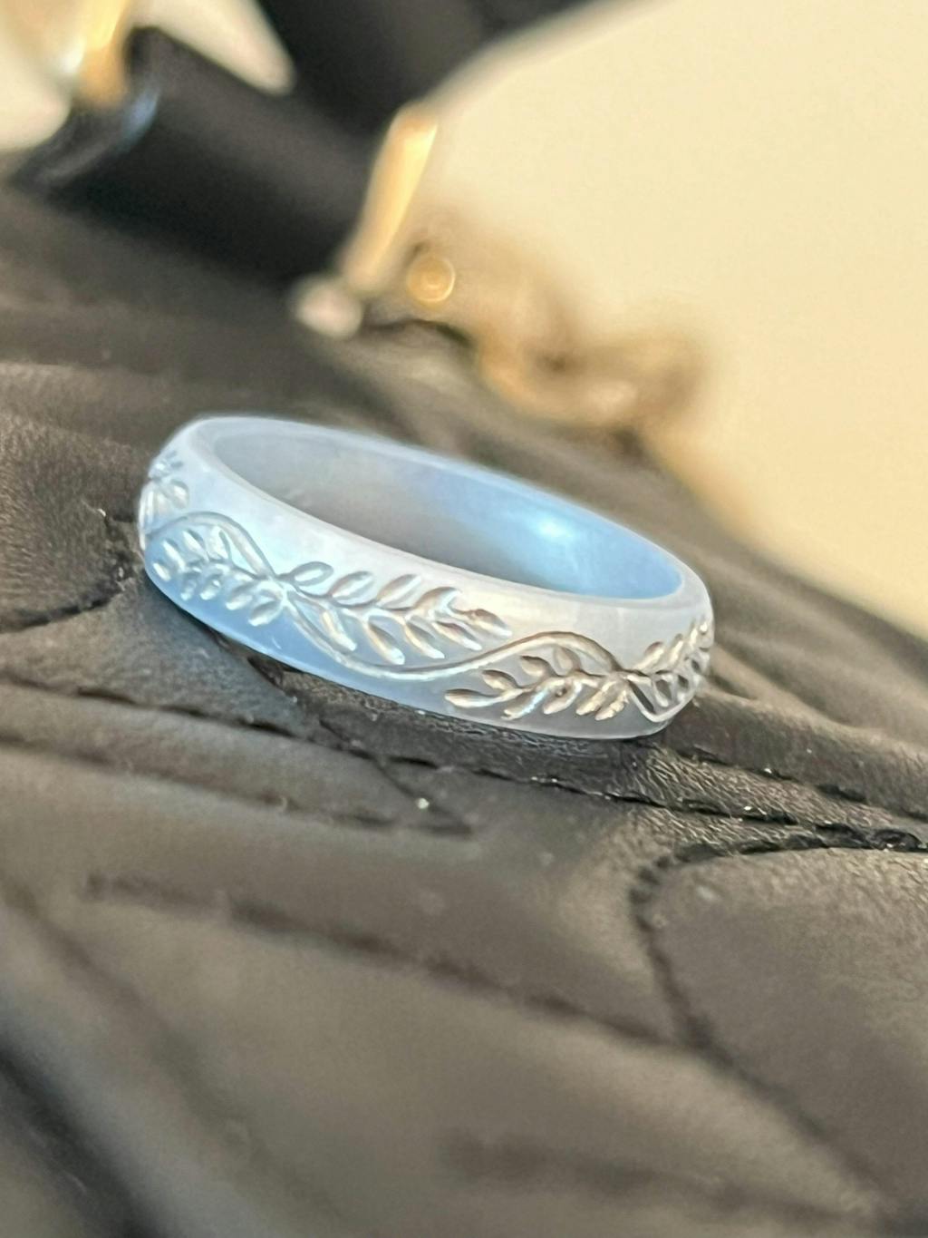 These rings are individually engraved then carefully inlayed with silver silicone ink, followed by a bake to cure the liquid silicone for longevity.